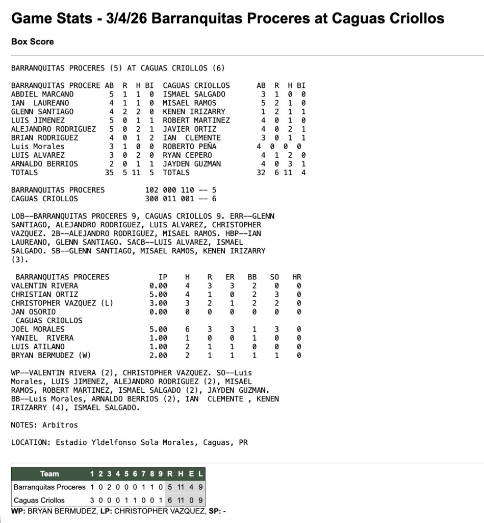 4 de marzo de 2026 7:30 pm Beisbol Superior Doble A 2026