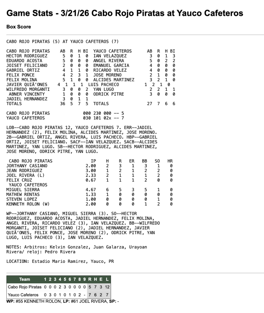 21 de marzo de 2026 7:30 pm Beisbol Superior Doble A 2026