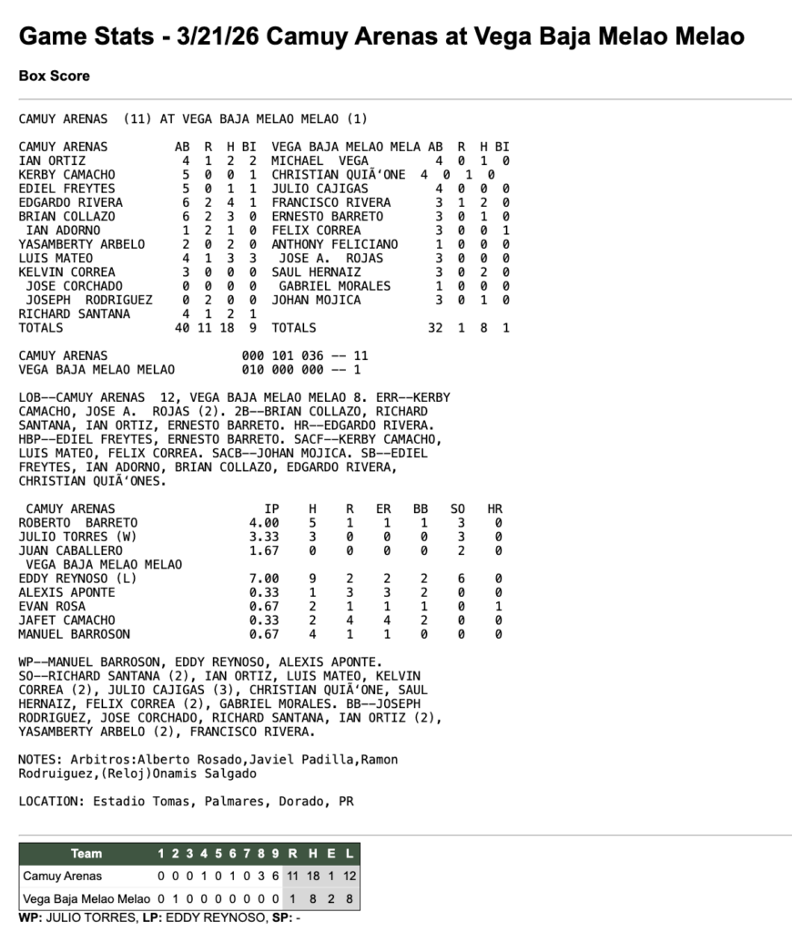 CamuyVega Baja 21 de marzo de 2026 11 - 1 Tiempo completo ResumenFacebookTweetEmail Detalles Fecha Hora Liga Temporada 21 de marzo de 2026 7:30 pm Beisbol Superior Doble A 2026 Estadio Estadio Tomás Palmares PR-693, Dorado, 00646, Puerto Rico ResultadosEquipoRResultadoCamuy11WinVega Baja1Loss
