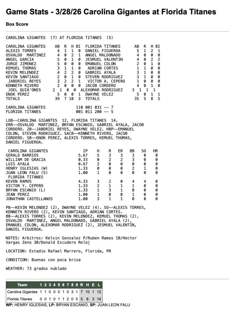 28 de marzo de 2026 7:30 pm Beisbol Superior Doble A 2026