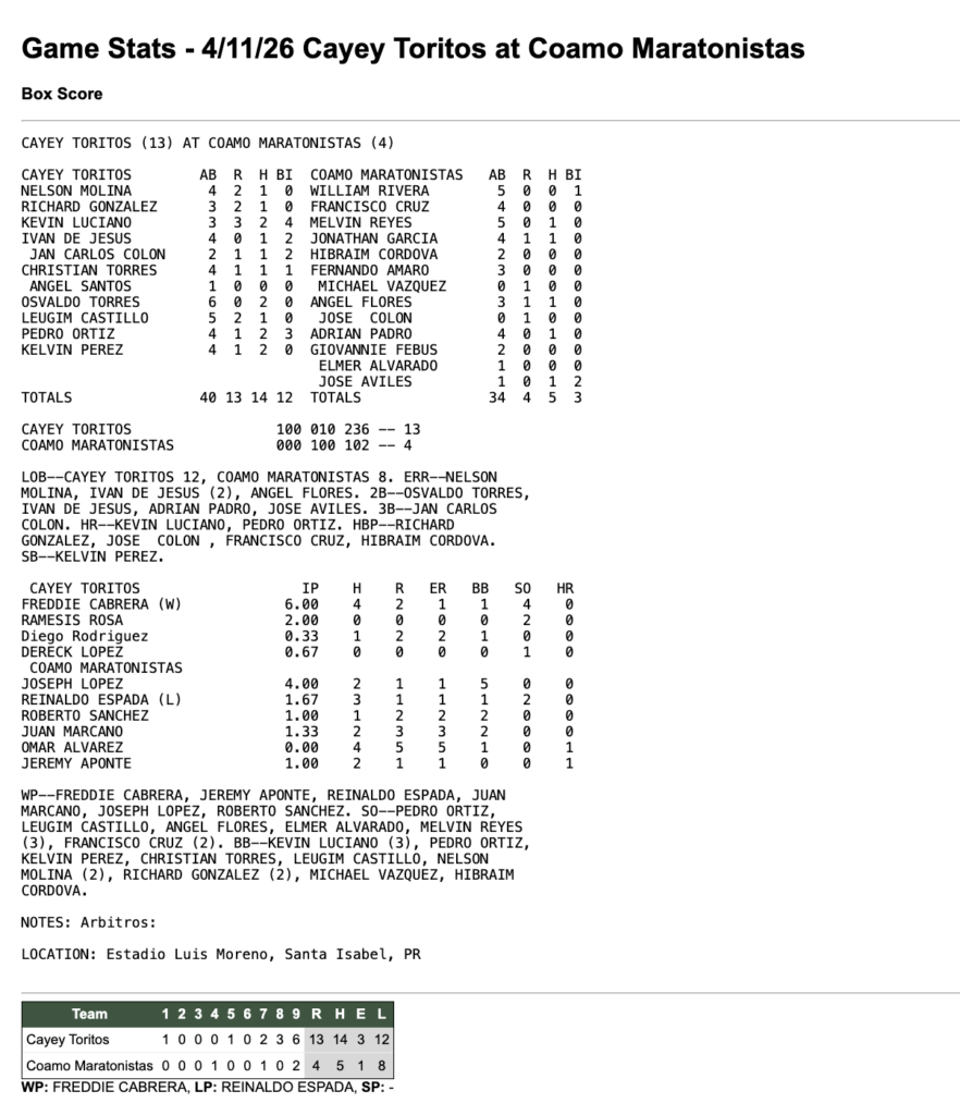 11 de abril de 2026 7:30 pm Beisbol Superior Doble A 2026