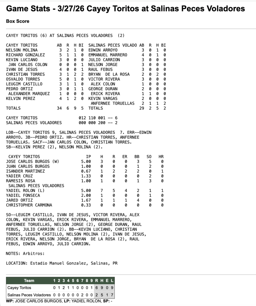 CayeySalinas 27 de marzo de 2026 6 - 2 Tiempo completo ResumenFacebookTweetEmail Detalles Fecha Hora Liga Temporada 27 de marzo de 2026 8:00 pm Beisbol Superior Doble A 2026 Estadio Estadio Manuel González Cll Agustin Colon Pacheco, Salinas, 00751, Puerto Rico ResultadosEquipoRResultadoCayey6WinSalinas2Loss