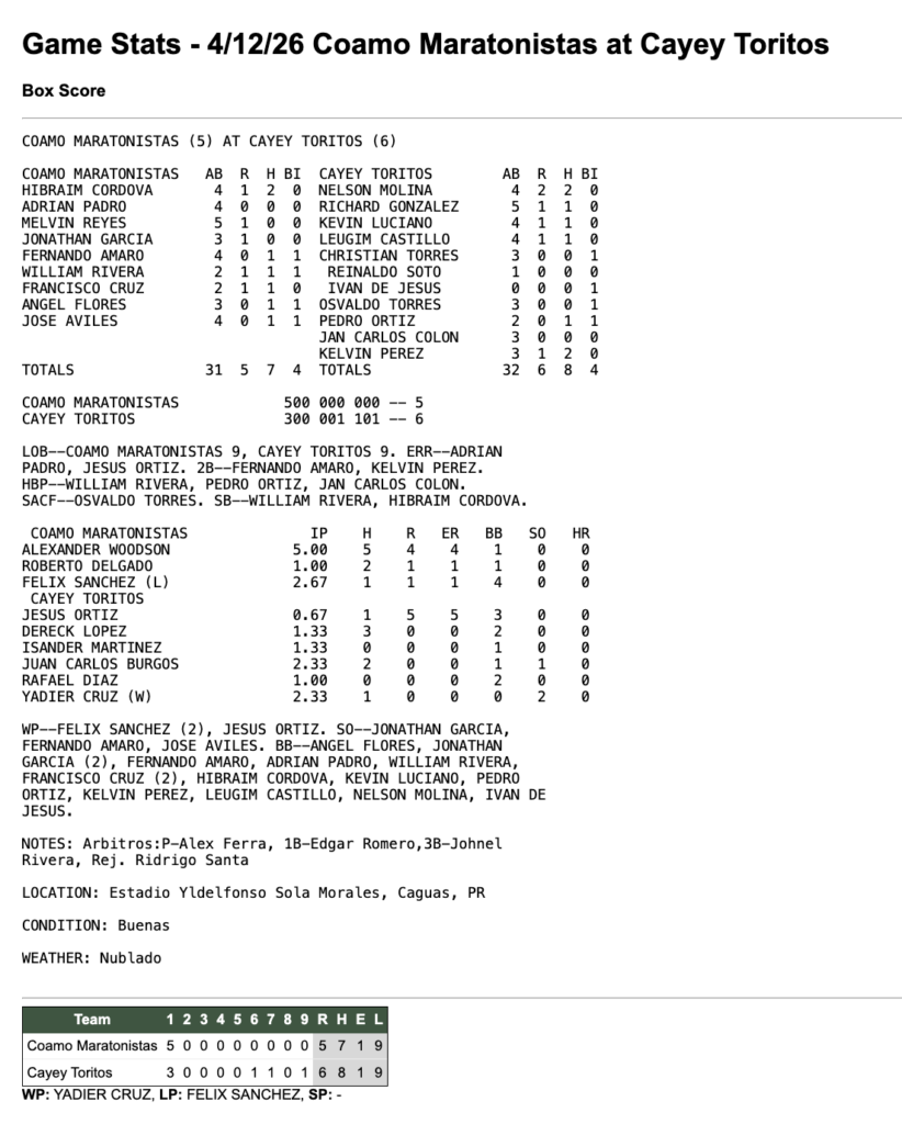 | 12 de abril de 2026 | 4:00 pm | Beisbol Superior Doble A | 2026 |