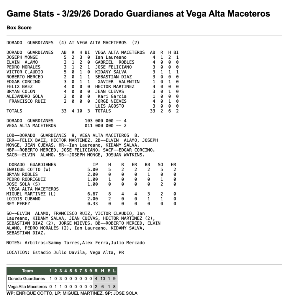 DoradoVega Alta 29 de marzo de 2026 4 - 2 Tiempo completo ResumenFacebookTweetEmail Detalles Fecha Hora Liga Temporada 29 de marzo de 2026 4:00 pm Beisbol Superior Doble A 2026 Estadio Estadio Julio "Papo" Dávila CM5G+FC8, Vega Alta, 00692, Puerto Rico ResultadosEquipoRResultadoDorado4WinVega Alta2Loss