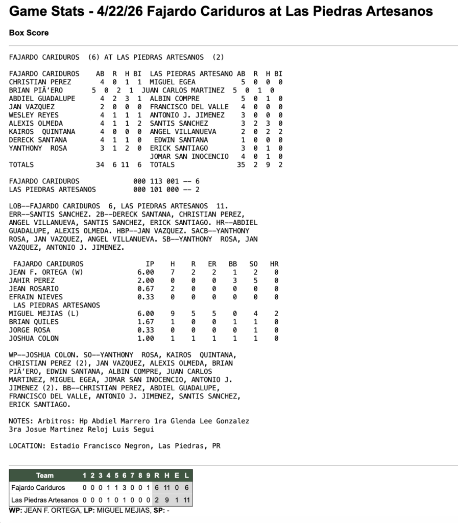 | 22 de abril de 2026 | 7:30 pm | Beisbol Superior Doble A | 2026 |