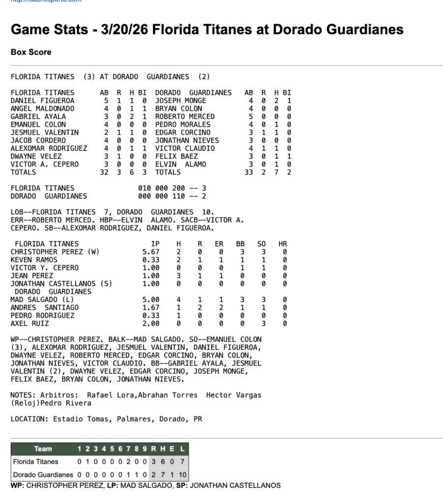 20 de marzo de 2026 8:00 pm Beisbol Superior Doble A 2026