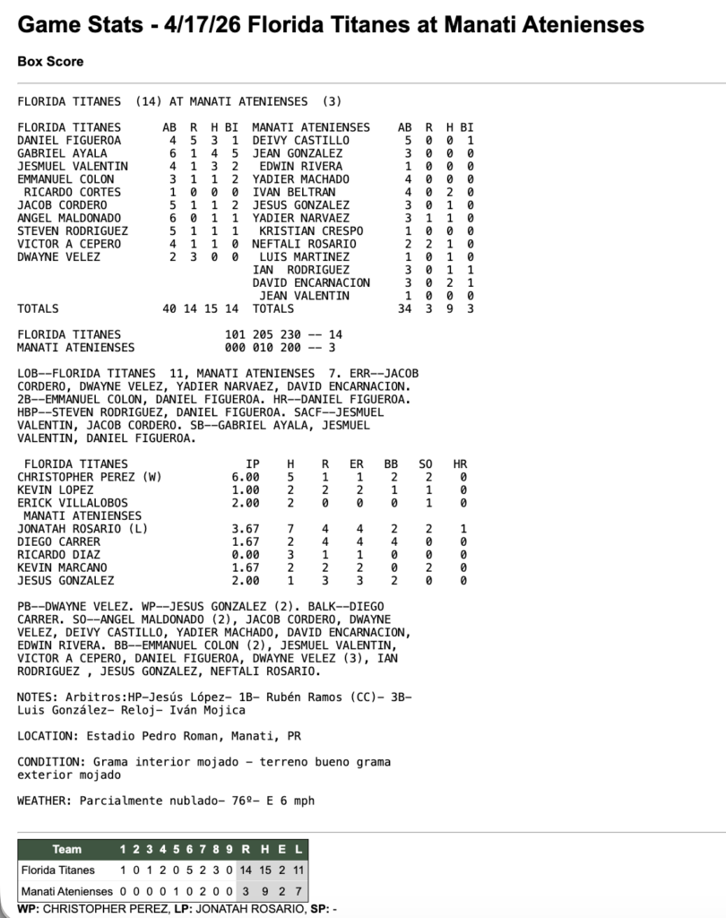 17 de abril de 2026 8:00 pm Beisbol Superior Doble A 2026
