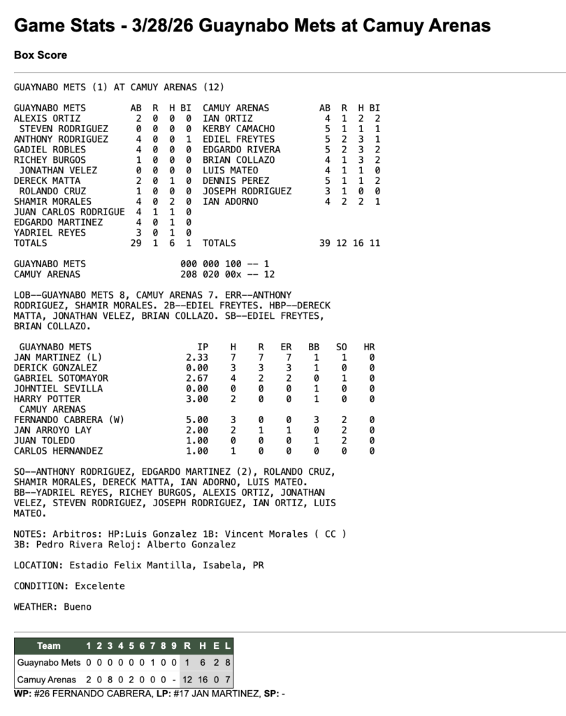 28 de marzo de 2026 7:30 pm Beisbol Superior Doble A 2026