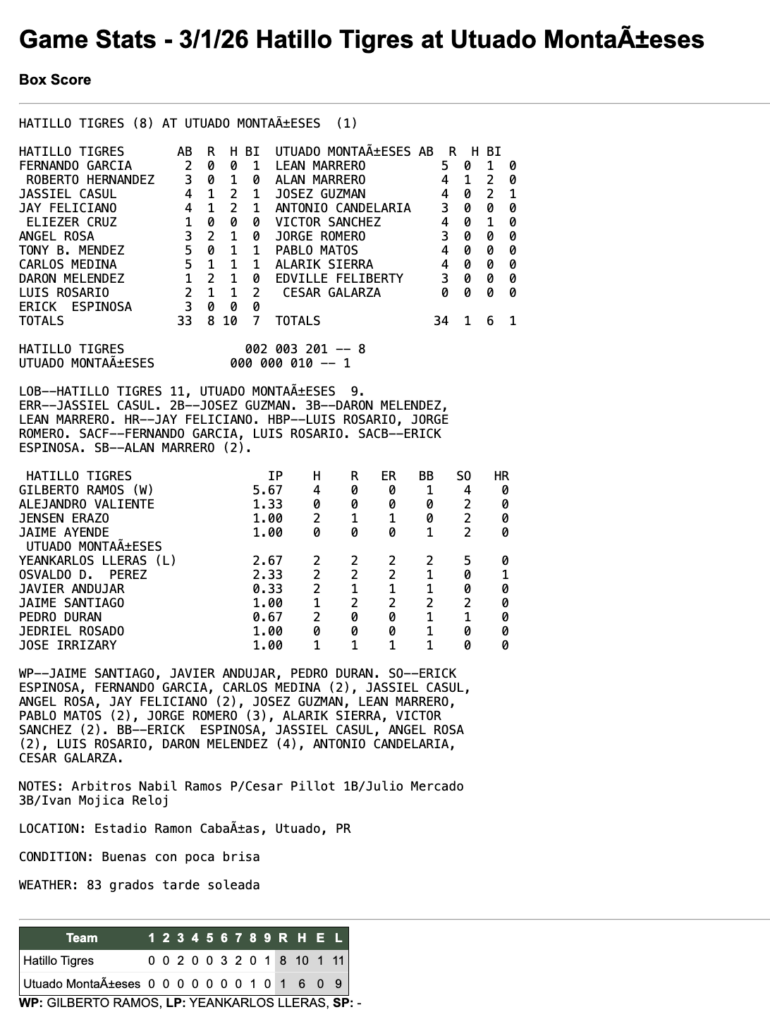 HatilloUtuado 1 de marzo de 2026 8 - 1 Tiempo completo ResumenFacebookTweetEmail Detalles Fecha Hora Liga Temporada 1 de marzo de 2026 3:00 pm Beisbol Superior Doble A 2026 Estadio Estadio Ramón Cabañas Ave Rolando Cabanas, Utuado, 00641, Puerto Rico ResultadosEquipoRResultadoHatillo8WinUtuado1Loss