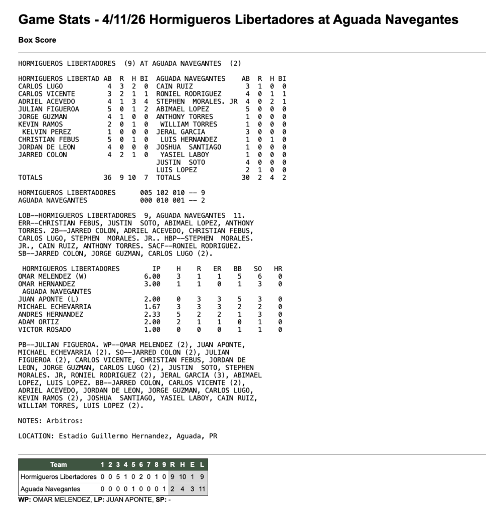 | 11 de abril de 2026 | 7:30 pm | Beisbol Superior Doble A | 2026 |