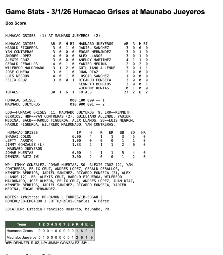 HumacaoMaunabo 1 de marzo de 2026 1 - 2 Tiempo completo ResumenFacebookTweetEmail Detalles Fecha Hora Liga Temporada 1 de marzo de 2026 4:00 pm Beisbol Superior Doble A 2026 Estadio Estadio Francisco Rosario Paoli PR-760, Maunabo, 00707, Puerto Rico ResultadosEquipoRResultadoHumacao1LossMaunabo2Win