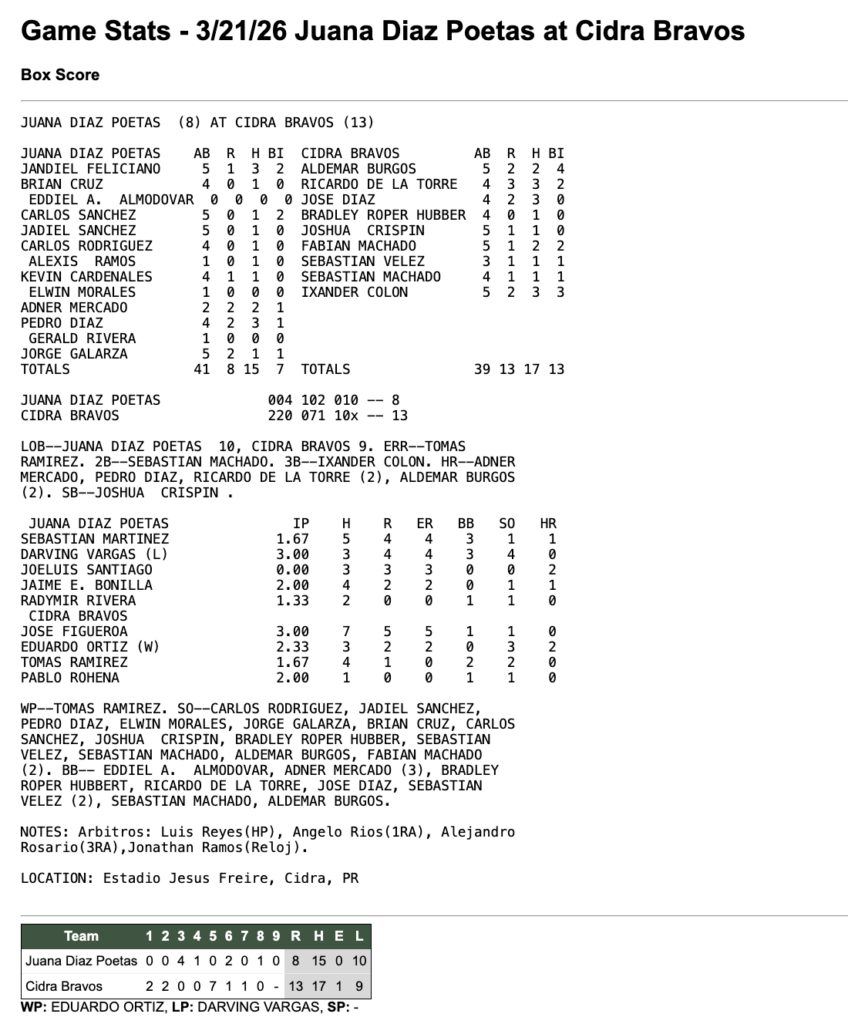 21 de marzo de 2026 7:30 pm Beisbol Superior Doble A 2026
