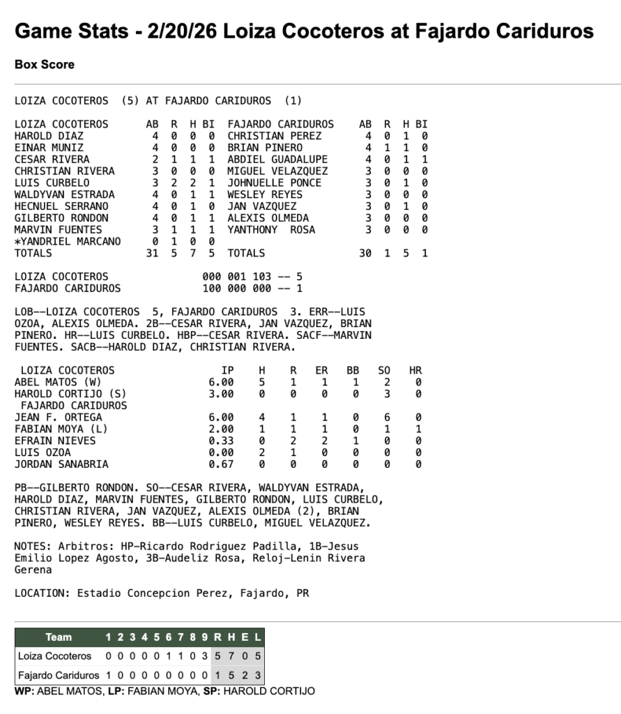 LoízaFajardo 20 de febrero de 2026 5 - 1 Tiempo completo ResumenFacebookTweetEmail Detalles Fecha Hora Liga Temporada 20 de febrero de 2026 8:00 pm Beisbol Superior Doble A 2026 Estadio Estadio Concepción Pérez Alberto 310-312 Av. Valero, Fajardo, 00738, Puerto Rico ResultadosEquipoRResultadoLoíza5WinFajardo1Loss