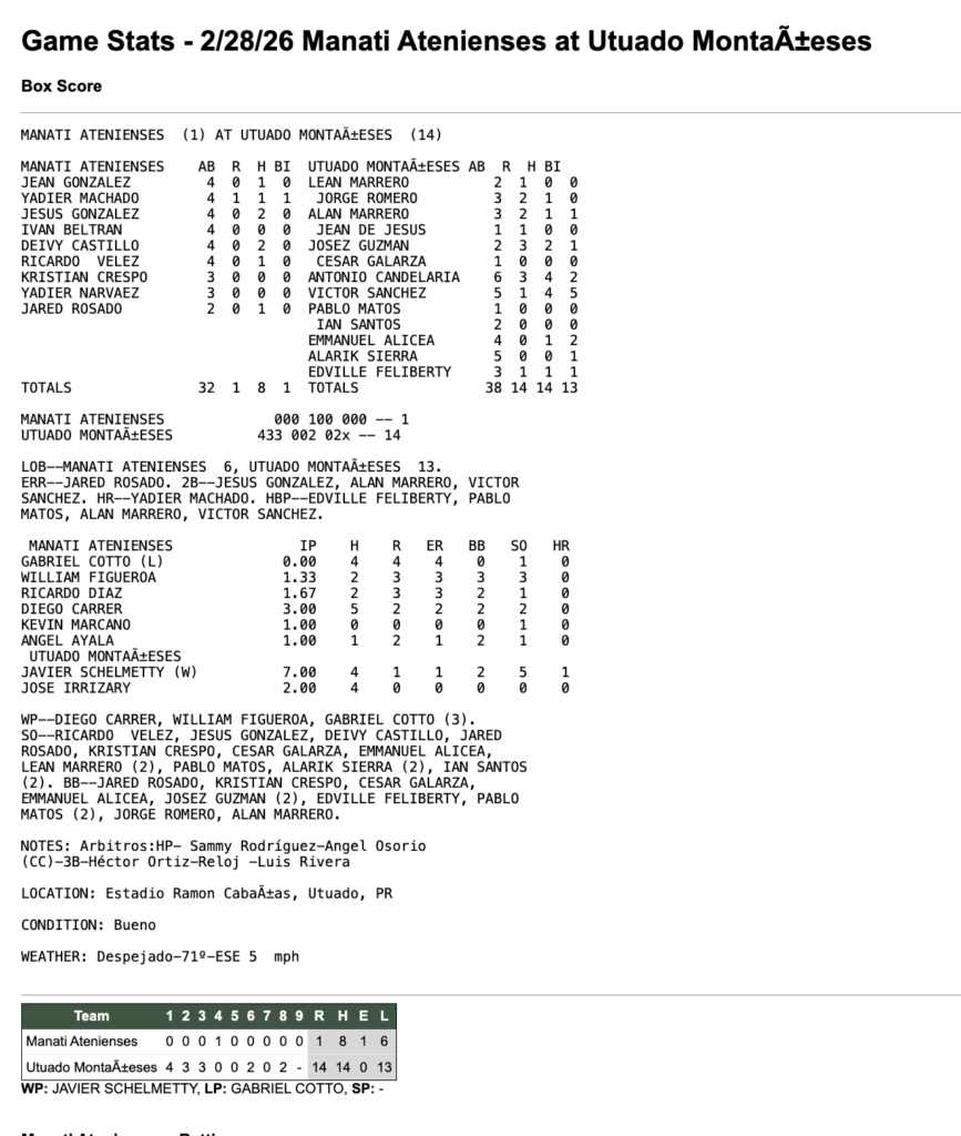 ManatíUtuado 28 de febrero de 2026 1 - 14 Tiempo completo ResumenFacebookTweetEmail Detalles Fecha Hora Liga Temporada 28 de febrero de 2026 7:30 pm Beisbol Superior Doble A 2026 Estadio Estadio Ramón Cabañas Ave Rolando Cabanas, Utuado, 00641, Puerto Rico ResultadosEquipoRResultadoManatí1LossUtuado14Win