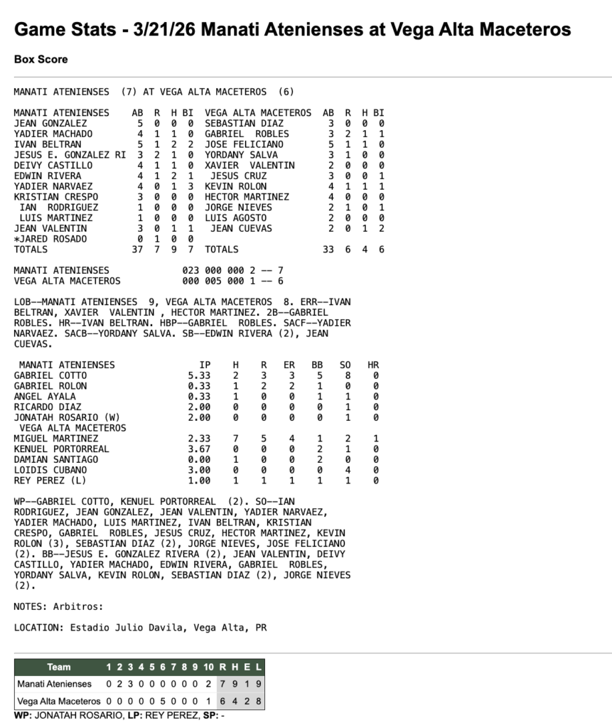 ManatíVega Alta 21 de marzo de 2026 7 - 6 Tiempo completo ResumenFacebookTweetEmail Detalles Fecha Hora Liga Temporada 21 de marzo de 2026 7:30 pm Beisbol Superior Doble A 2026 Estadio Estadio Julio "Papo" Dávila CM5G+FC8, Vega Alta, 00692, Puerto Rico ResultadosEquipoRResultadoManatí7WinVega Alta6Loss