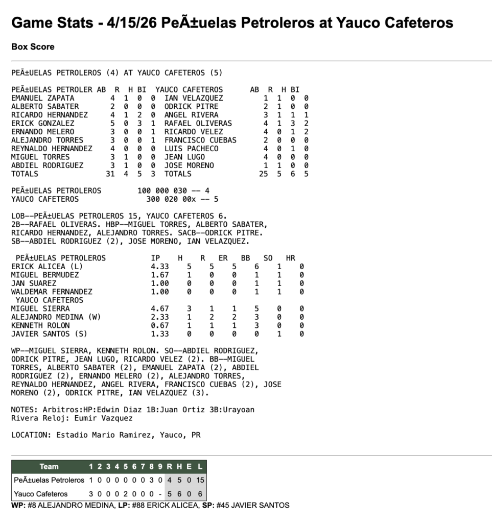 PeñuelasYauco 15 de abril de 2026 4 - 5 Tiempo completo ResumenFacebookTweetEmail Detalles Fecha Hora Liga Temporada 15 de abril de 2026 7:30 pm Beisbol Superior Doble A 2026 Estadio Estadio Mario ‘Ñato’ Ramírez C. Palma Real, Yauco, 00698, Puerto Rico ResultadosEquipoRResultadoPeñuelas4LossYauco5Win