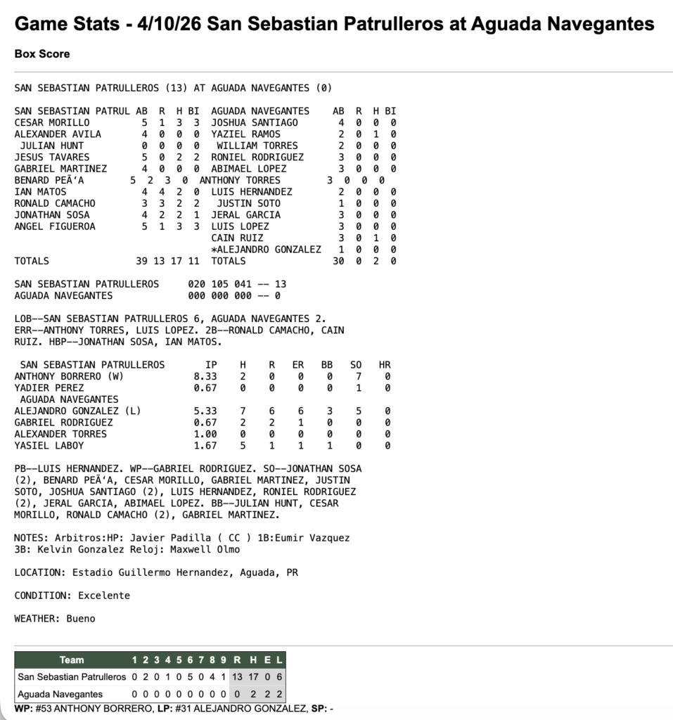 | 10 de abril de 2026 | 8:00 pm | Beisbol Superior Doble A | 2026 |