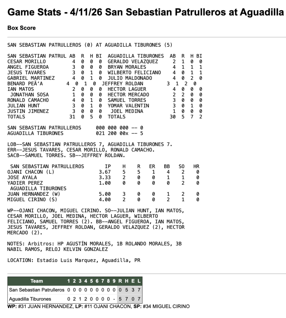 | 11 de abril de 2026 | 7:30 pm | Beisbol Superior Doble A | 2026 |