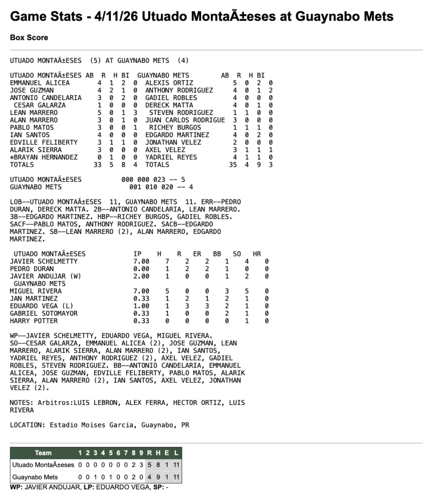11 de abril de 2026 7:30 pm Beisbol Superior Doble A 2026