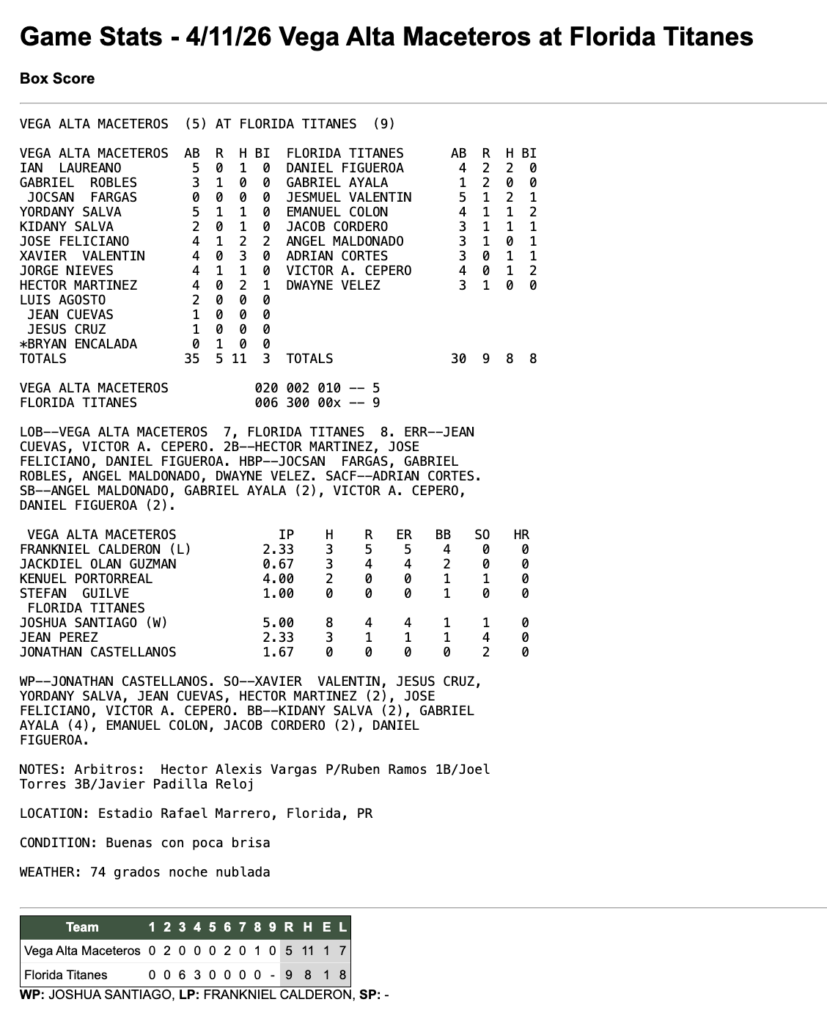 11 de abril de 2026 7:30 pm Beisbol Superior Doble A 2026