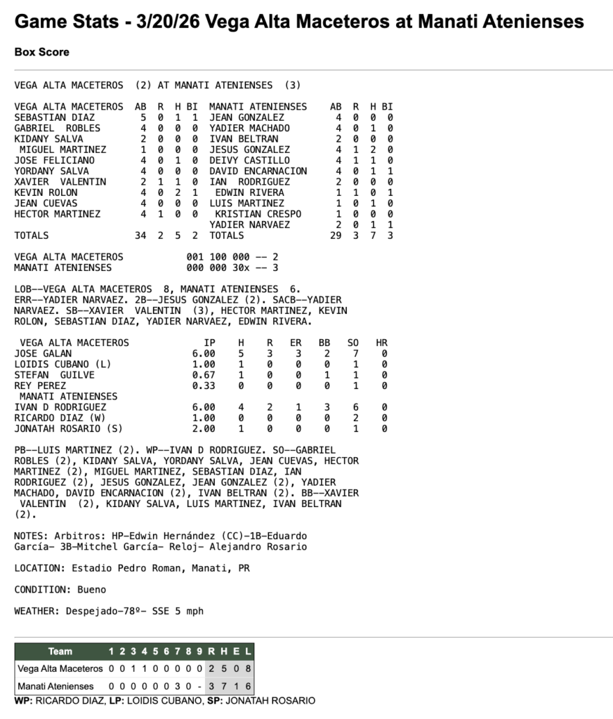 Vega AltaManatí 20 de marzo de 2026 2 - 3 Tiempo completo ResumenFacebookTweetEmail Detalles Fecha Hora Liga Temporada 20 de marzo de 2026 8:00 pm Beisbol Superior Doble A 2026 Estadio Estadio Pedro Román Meléndez PR-670, Manatí, 00674, Puerto Rico ResultadosEquipoRResultadoVega Alta2LossManatí3Win
