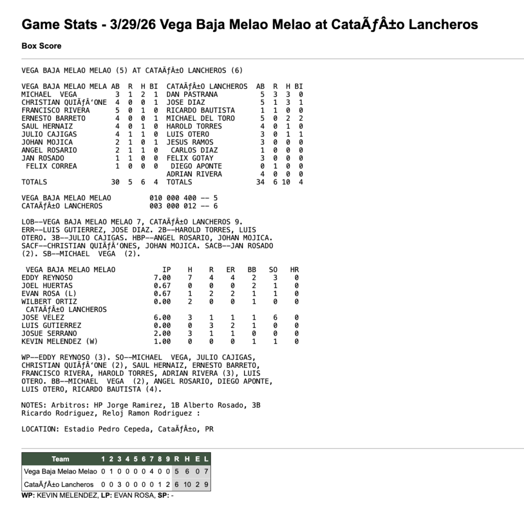 Vega BajaCataño 29 de marzo de 2026 5 - 6 Tiempo completo ResumenFacebookTweetEmail Detalles Fecha Hora Liga Temporada 29 de marzo de 2026 5:00 pm Beisbol Superior Doble A 2026 Estadio Estadio Pedro "Perucho" Cepeda CVQF+8P8, Cataño, 00962, Puerto Rico ResultadosEquipoRResultadoVega Baja5LossCataño6Win