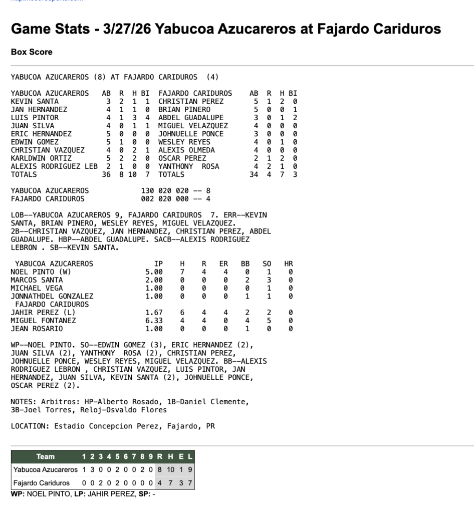 YabucoaFajardo 27 de marzo de 2026 8 - 4 Tiempo completo ResumenFacebookTweetEmail Detalles Fecha Hora Liga Temporada 27 de marzo de 2026 8:00 pm Beisbol Superior Doble A 2026 Estadio Estadio Concepción Pérez Alberto 310-312 Av. Valero, Fajardo, 00738, Puerto Rico ResultadosEquipoRResultadoYabucoa8WinFajardo4Loss