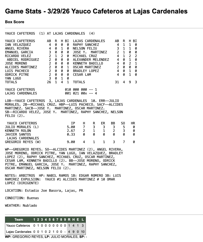 YaucoLajas 29 de marzo de 2026 1 - 4 Tiempo completo ResumenFacebookTweetEmail Detalles Fecha Hora Liga Temporada 29 de marzo de 2026 4:00 pm Beisbol Superior Doble A 2026 Estadio Estadio José "Joe" Basora [22 - 199] PR-315, Lajas, PR 00667 ResultadosEquipoRResultadoYauco1LossLajas4Win