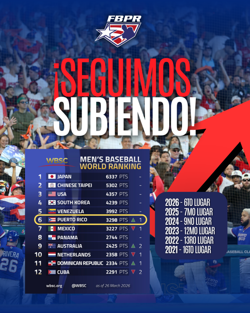 La Federación de Béisbol de Puerto Rico (FBPR) alcanzó por primera vez en su historia el sexto puesto del ranking mundial de béisbol masculino de la World Baseball Softball Confederation (WBSC), tras la actualización divulgada este jueves luego de adjudicarse los resultados del Clásico Mundial de Béisbol 2026.